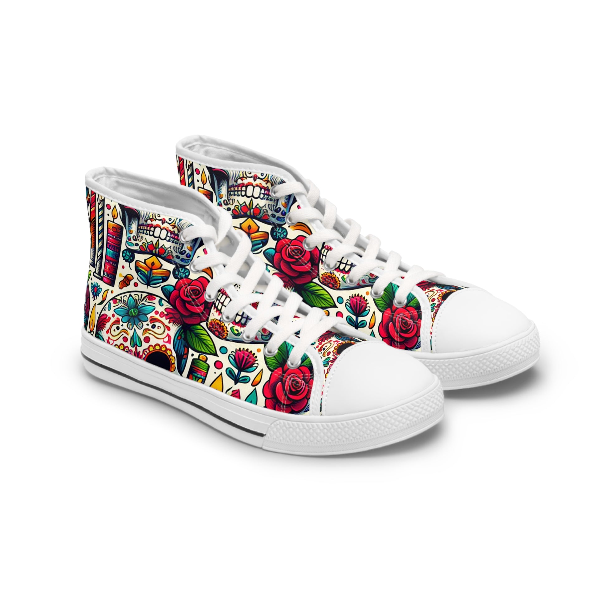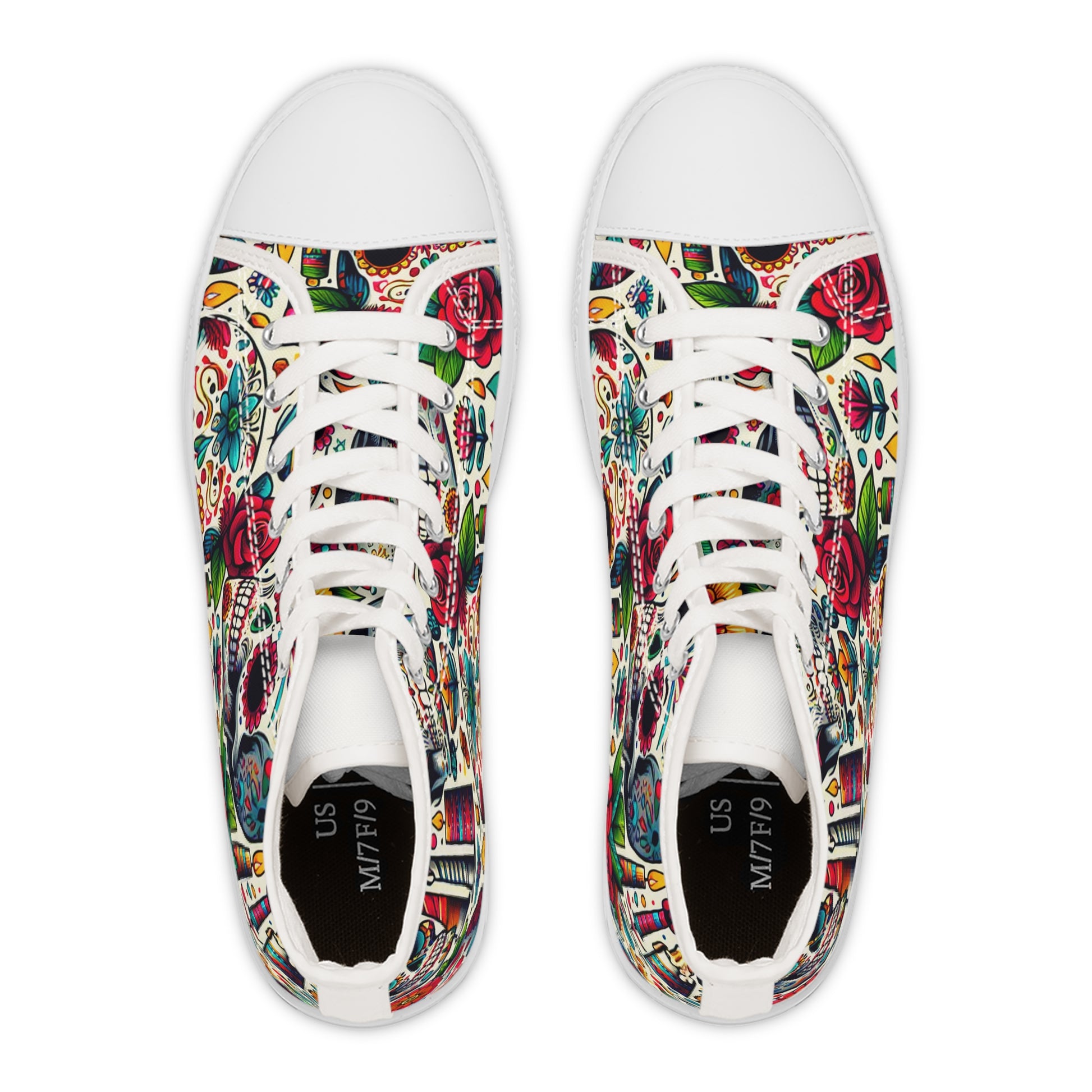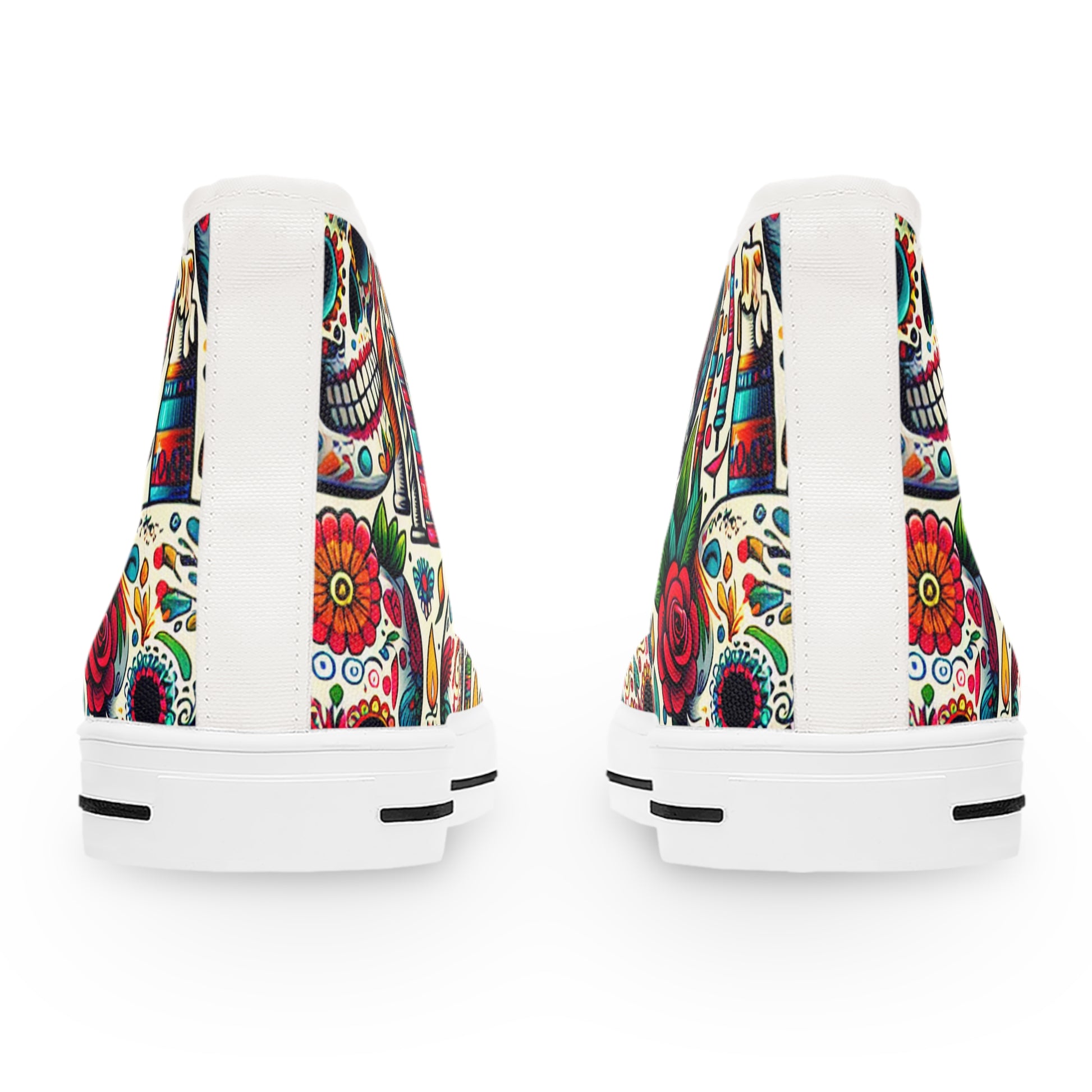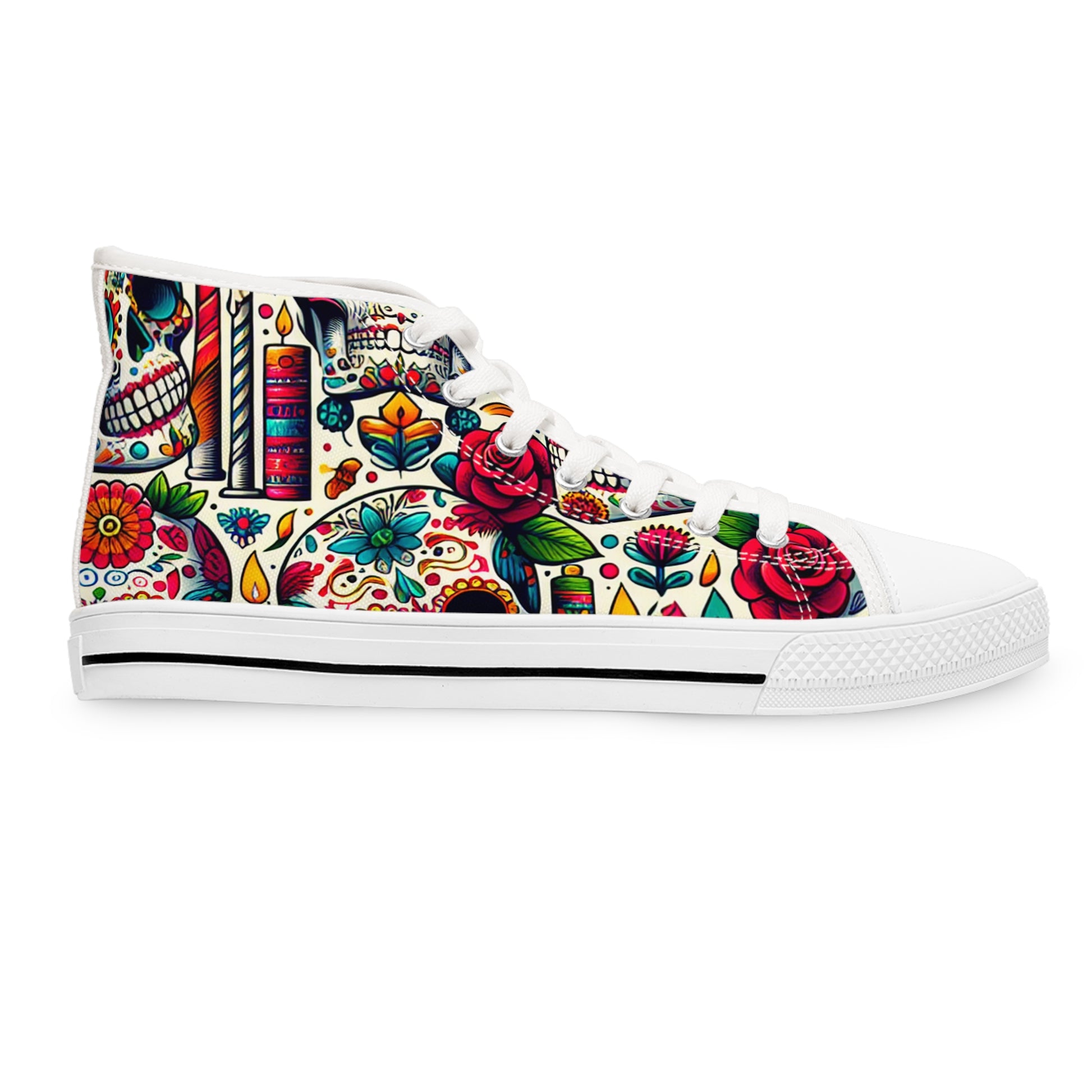 "Day of the Dead Delights: Colorful High-Top Sneakers Embellished with Vibrant Skulls and Floral Patterns"- High Top Trainers Fashion Sneakers