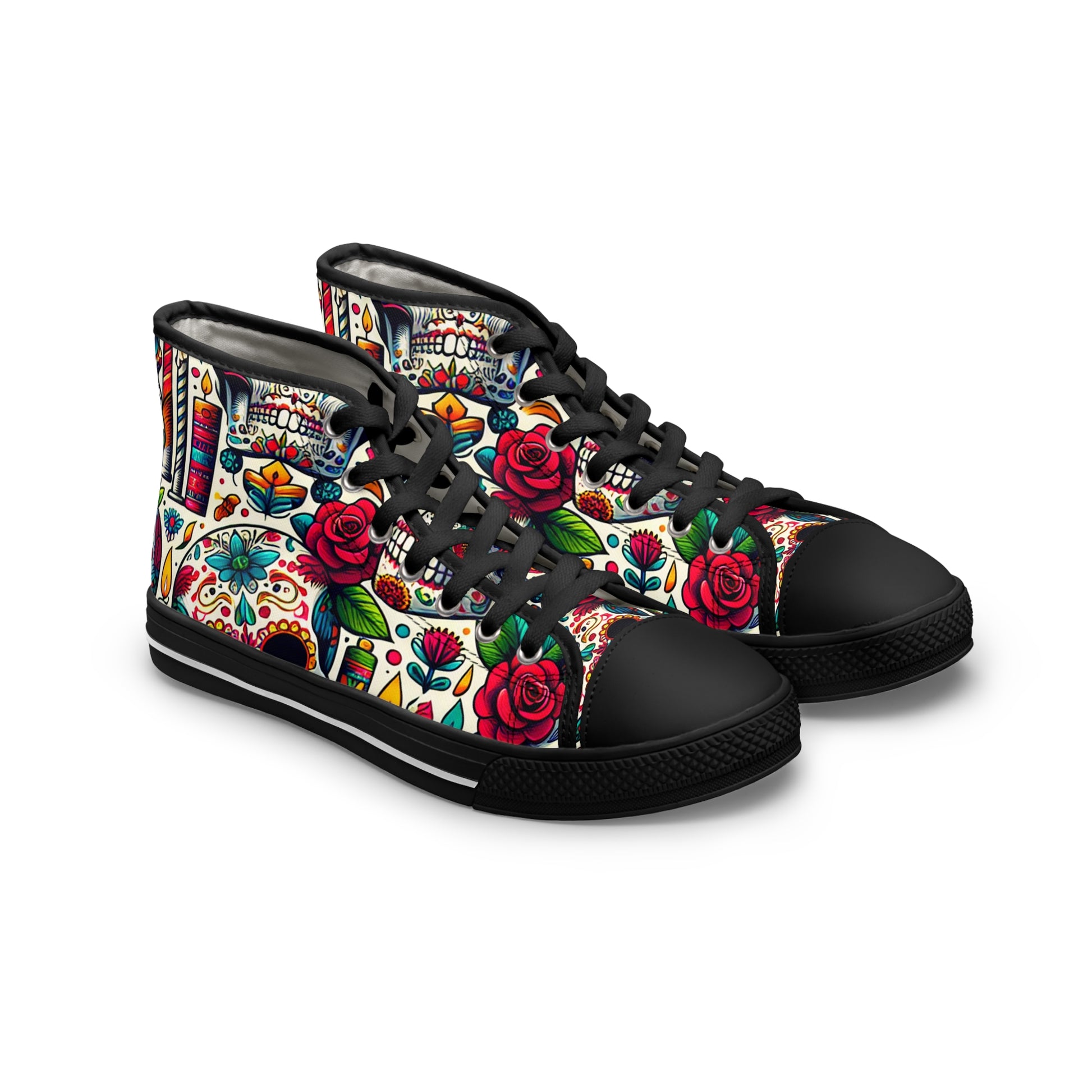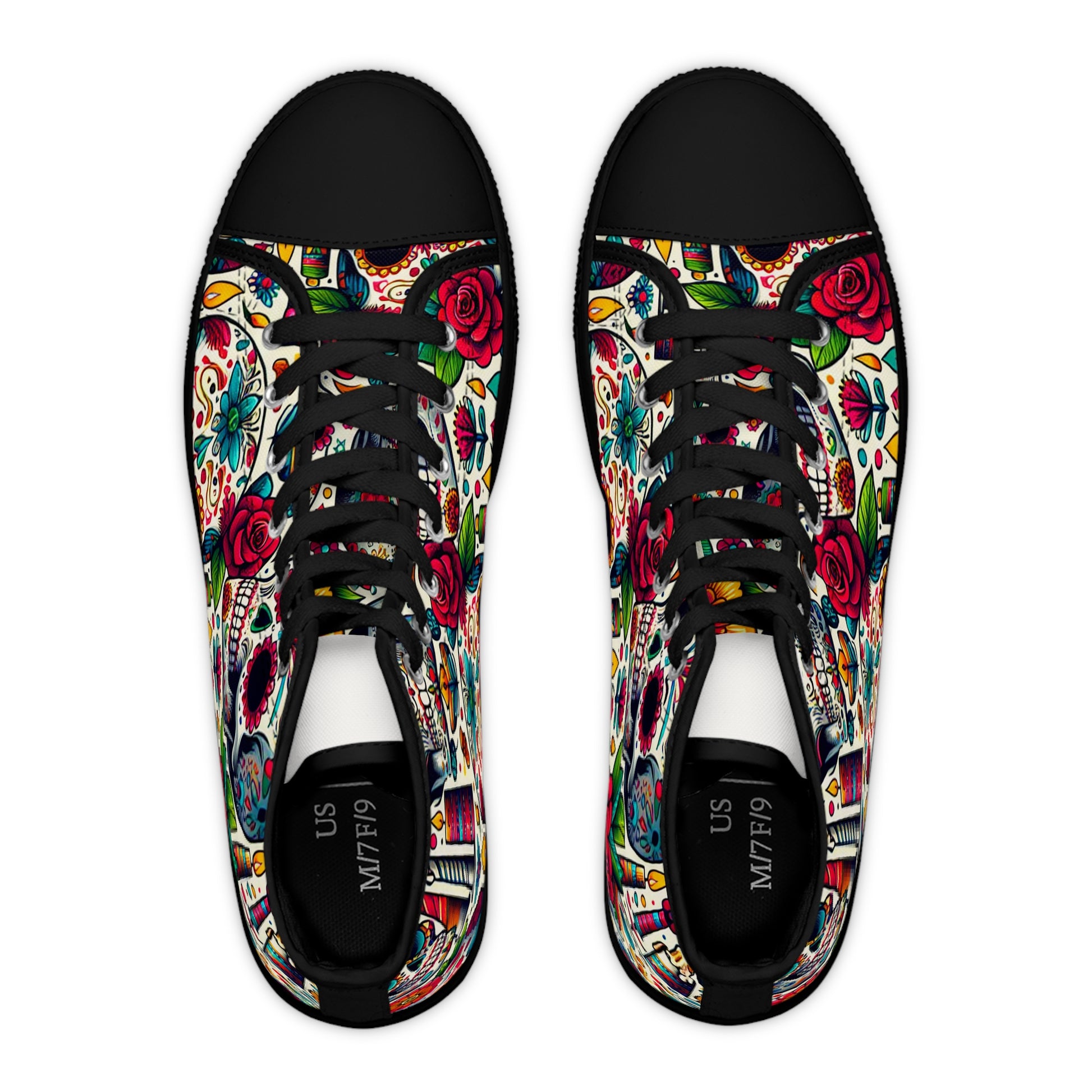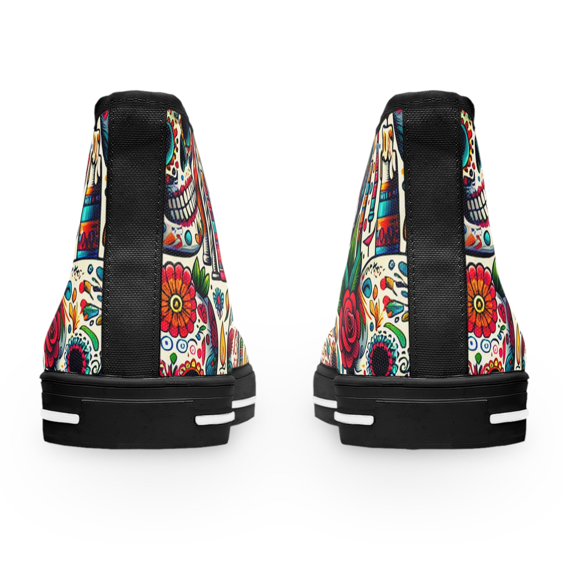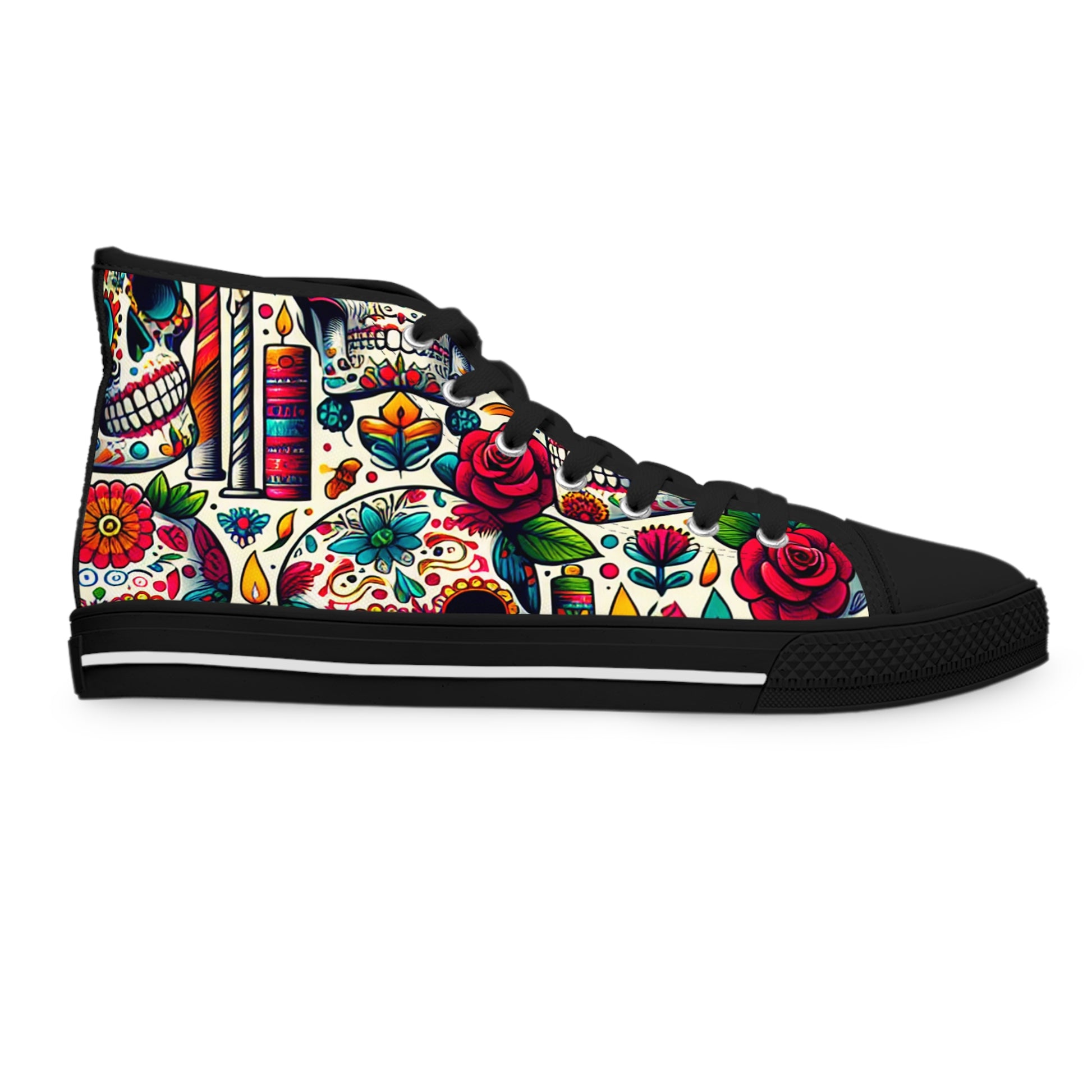 "Day of the Dead Delights: Colorful High-Top Sneakers Embellished with Vibrant Skulls and Floral Patterns"- High Top Trainers Fashion Sneakers